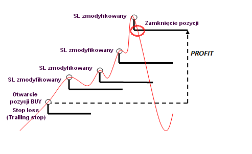 Wyobraźmy sobie, że otworzyłeś pozycję długą i rynek idzie w dobrym kierunku. Dzięki temu w tym momencie Twoja transakcja jest zyskowna. Początkowy SL umieściłeś pod ceną otwarcia i teraz możesz go przenieść wyżej na poziom ceny otwarcia zlecenia lub trochę powyżej. Jeśli rynek zacznie spadać, Twoje zyski będą zabezpieczone, jednak musiałbyś ręcznie przesuwać SL na coraz wyższe poziomy.