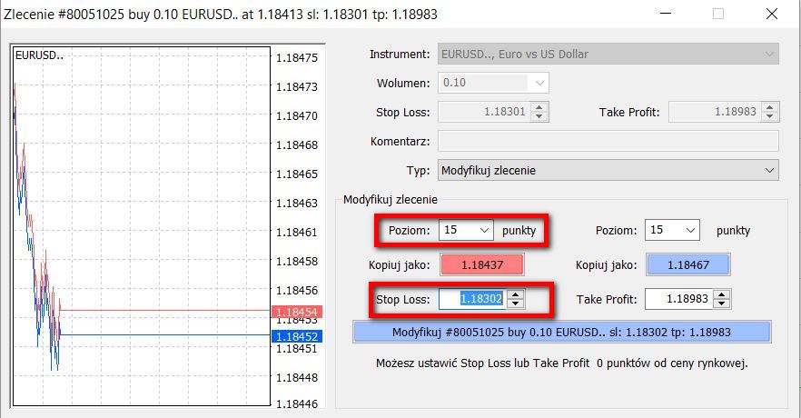 Zostanie wyświetlone okno modyfikacji zleceń, w którym możesz wprowadzić lub zmienić poziomy SL/TP według bieżącej sytuacji na danym rynku. Możesz również ustalić w punktach odpowiednią odległość od aktualnej ceny rynkowej.