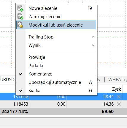 Możesz to zrobić również z dolnego modułu "Terminal". Aby dodać lub zmodyfikować poziomy SL/TP, wystarczy kliknąć prawym przyciskiem myszy na otwartej pozycji lub zleceniu oczekującym i wybrać polecenie "Modyfikuj lub usuń zlecenie".