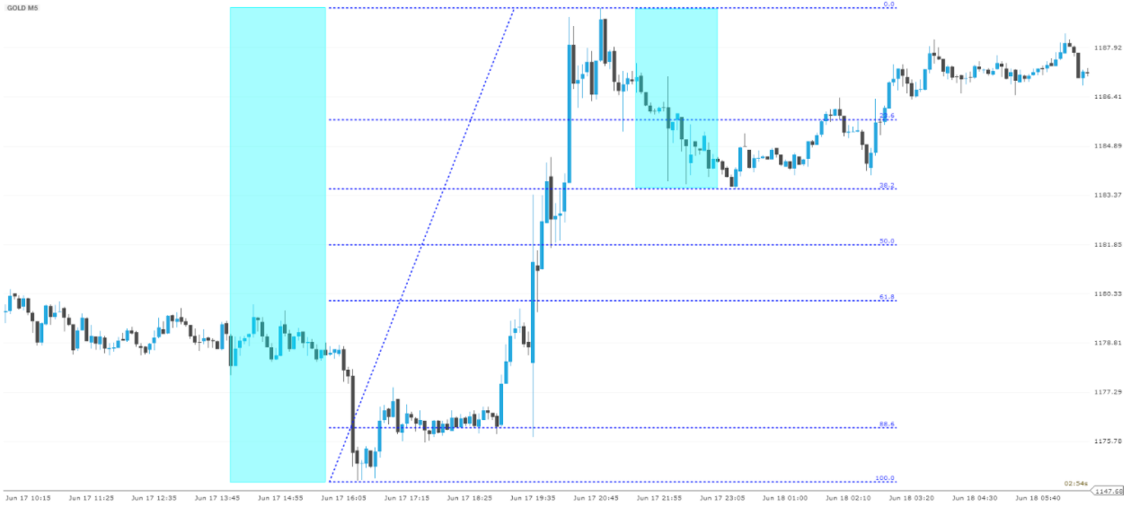 Przykładowo, na poniższym wykresie złota widzimy, że cena wzrastała w kierunku 1190 USD za uncję. Następnie miała miejsce korekta przy poziomie zniesienia 38,2% ostatniej fali wznoszącej, a później doszło do stabilizacji i kontynuacji trendu wzrostowego.