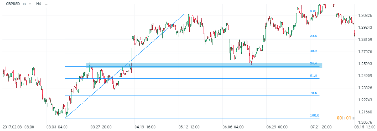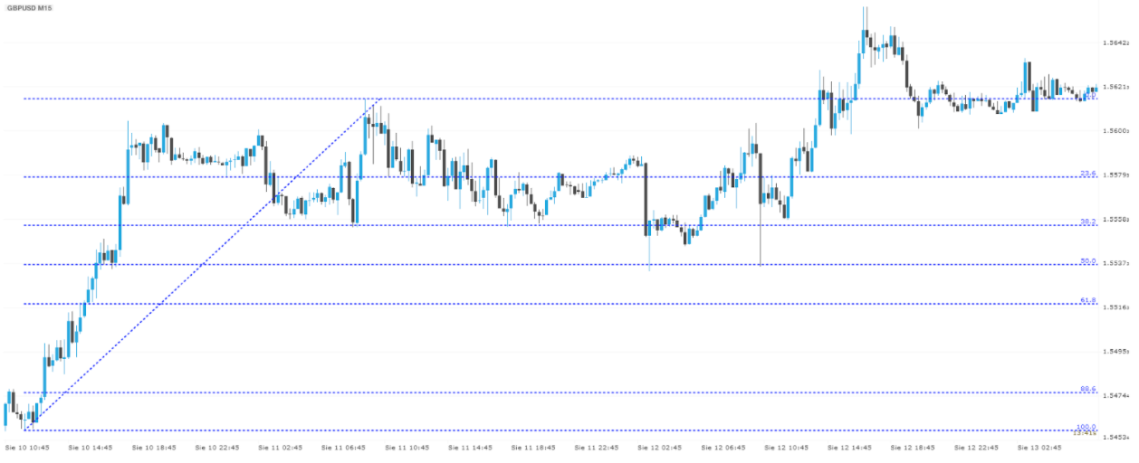 Kolejny wykres pokazuje parę GBPUSD na interwale 15-minutowym, gdzie mamy do czynienia z korektą w kierunku zniesienia 38,2%. Niestety, notowaniom nie udało się ustabilizować przy tym poziomie i deprecjacja była kontynuowana aż do zniesienia 50%. W tym punkcie para odbiła wspinając się na nowe szczyty i wznawiając trend wzrostowy.