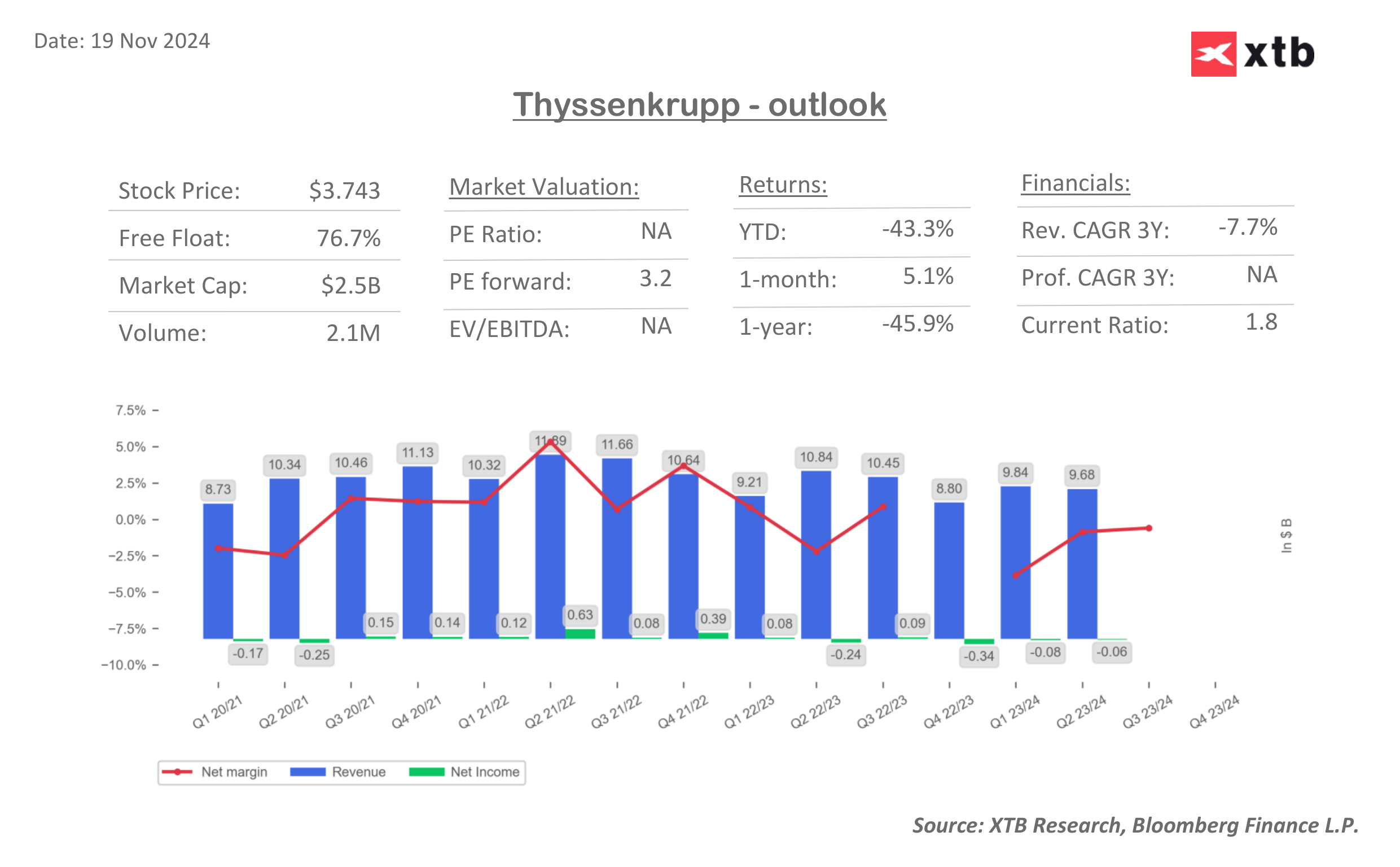 A Thyssenkrupp prevê um crescimento das vendas de 0% a 3% no ano fiscal de 2024/2025. As perspetivas da empresa estimam um Ebit ajustado de 600 milhões a mil milhões de euros, contra a previsão de 820 milhões de euros da Bloomberg, e um lucro líquido de 100 milhões a 500 milhões de euros, contra as expectativas de 595,2 milhões. O dividendo por ação deverá ser de 0,15 euros por ação este ano, contra 0,12 euros previstos; com um prejuízo líquido de 1,51 mil milhões de euros (347,5 milhões de euros previstos). Consequentemente, o prejuízo por ação é de 3,3 euros contra 0,3 euros previstos. As vendas caíram para 35 mil milhões de euros; a estimativa era de 34,87 mil milhões de euros (-6,6%).