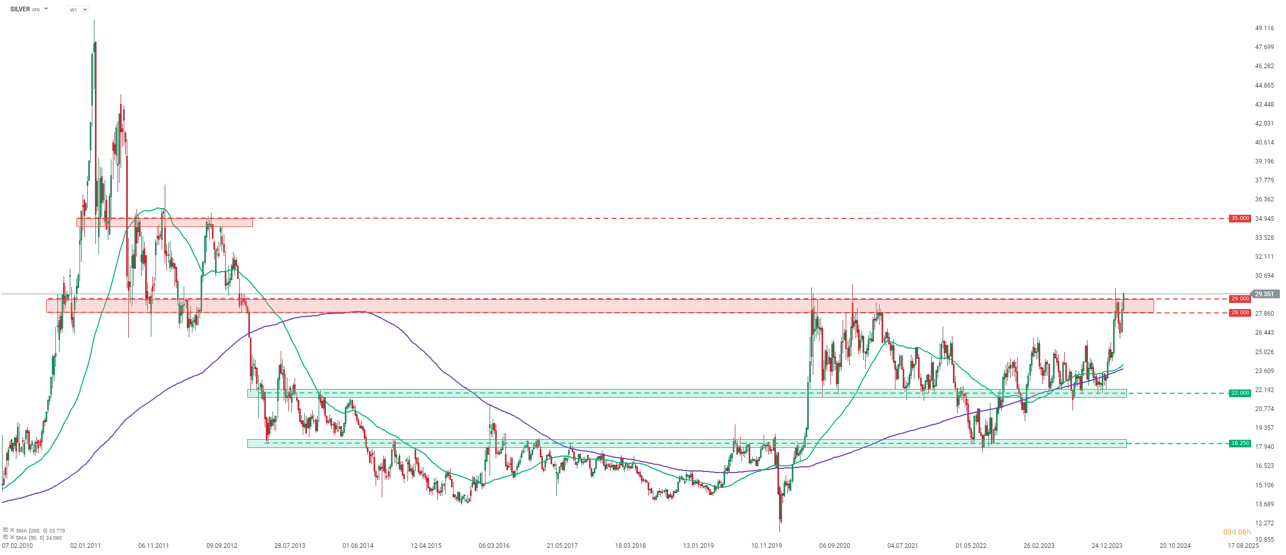 A prata merece uma atenção especial, uma vez que volta a subir acima da marca dos 29 dólares por onça, apagando a correção do final de abril. O metal precioso está a caminho de registrar o maior fechamento diário desde o primeiro trimestre de 2013! Dando uma olhada no gráfico SILVER no intervalo W1, podemos ver que o metal precioso está dando um salto acima da zona de resistência de $ 28-29 hoje, que limitou os movimentos ascendentes desde meados de 2020. Se virmos uma quebra clara acima deste obstáculo, a próxima zona de resistência de longo prazo pode ser encontrada na área de US $ 35 por onça, marcada com máximos locais de 2011-2012.