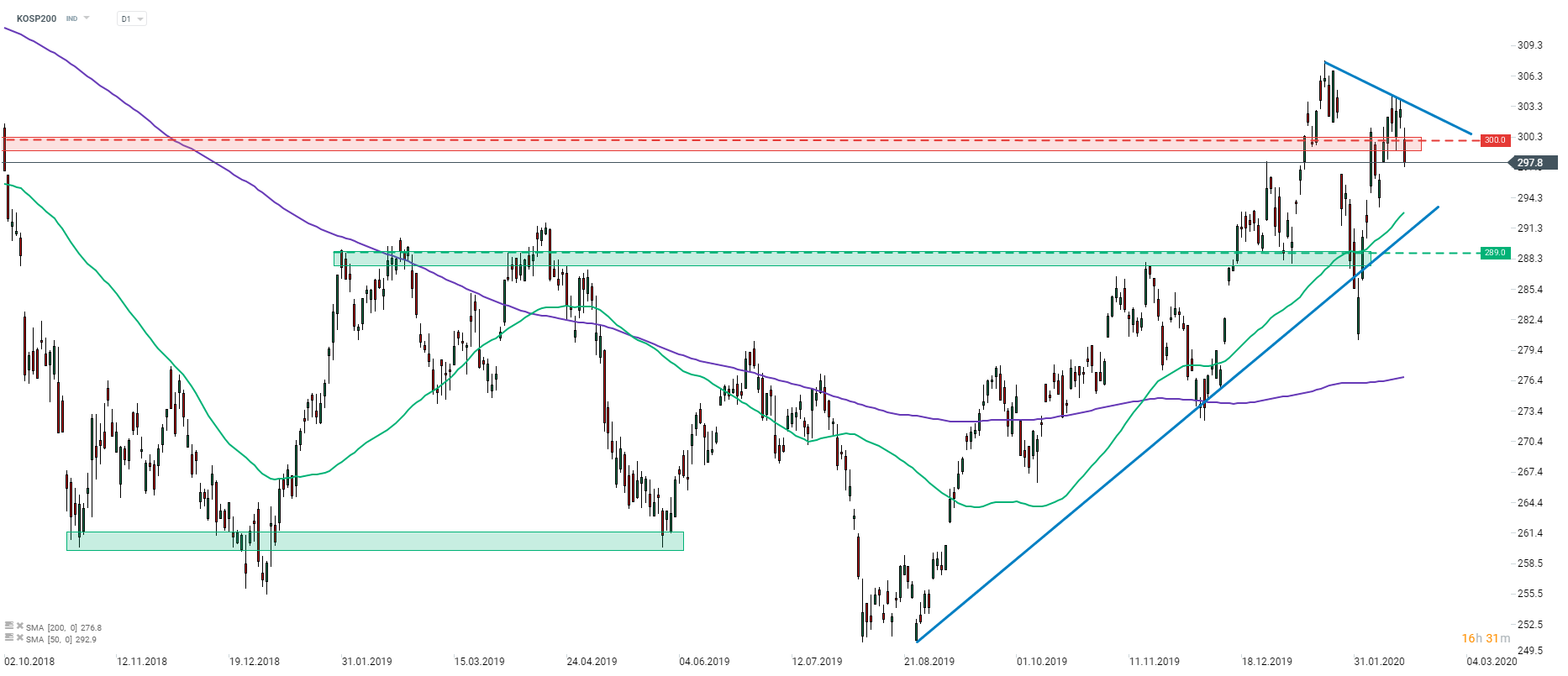 O índice coreano (KOSP200) luta para manter se manter em alta, uma vez que uma a queda no curto-prazo. O índice está a recuar abaixo da capacidade dos 300 pts hoje, ameaçando testar a linha de tendência ascendente dos últimos dias. Fonte: xStation5