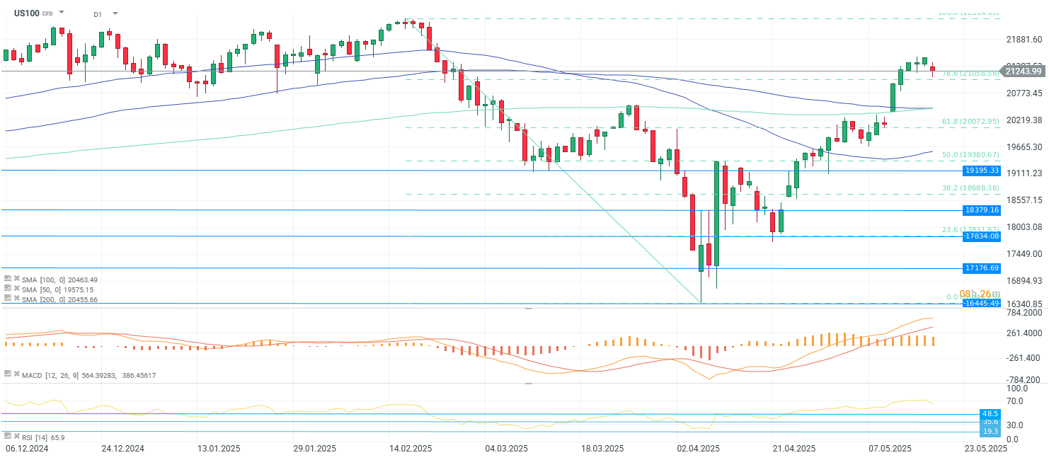 O Nasdaq 100, representado pelo US100, está a tentar testar novamente o nível de retração de Fibonacci de 23,6% — uma zona-chave que pode funcionar como resistência. Os compradores buscarão retestar as máximas anteriores, enquanto os vendedores podem tentar uma retração em direção às médias móveis de 200 e 100 dias, com o nível de retração de 38,2% como a próxima meta potencial de baixa. O RSI está começando a divergir para baixo após atingir níveis de sobrecompra, enquanto o MACD se estreita, o que pode resultar em uma possível divergência de baixa. Fonte: xStation