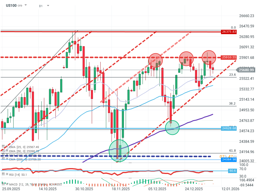 Os compradores têm um problema evidente em superar a zona de resistência em torno de 25.900. O impulso ascendente enfraqueceu claramente no final de 2025 e ainda enfrenta desafios. O mercado já rebatou a zona de resistência três vezes, criando uma alta probabilidade de correção com uma faixa-alvo entre os níveis FIBO 23,6 e 38,2.