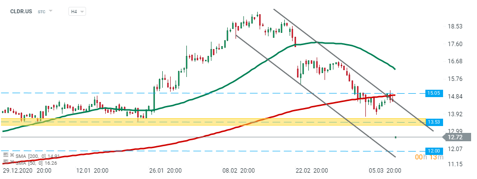 Cloudera (CLDR.US)  - Hoje, pode-se ver que o movimento descendente continua após a abertura dos EUA. A acção começou a sessão de hoje abaixo do suporte principal em $13,53. Se o sentimento atual prevalecer, o próximo suporte de $12,00 pode estar em risco. Fonte: xStation5