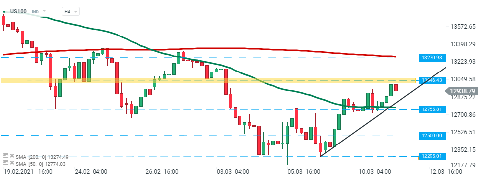 US100 - Resistência nos 13046 pts. Caso ocorra uma quebra maior, o movimento ascendente pode acelerar. A próxima meta em alta são os 13,270 pontos e é reforçado por 200 SMA (linha vermelha). Por outro lado, se os vendedores conseguirem quebrar abaixo da linha de tendência de alta, outro impulso de baixa em direção ao suporte de $12.755 pontos poderá ser alcançado. Fonte: xStation5