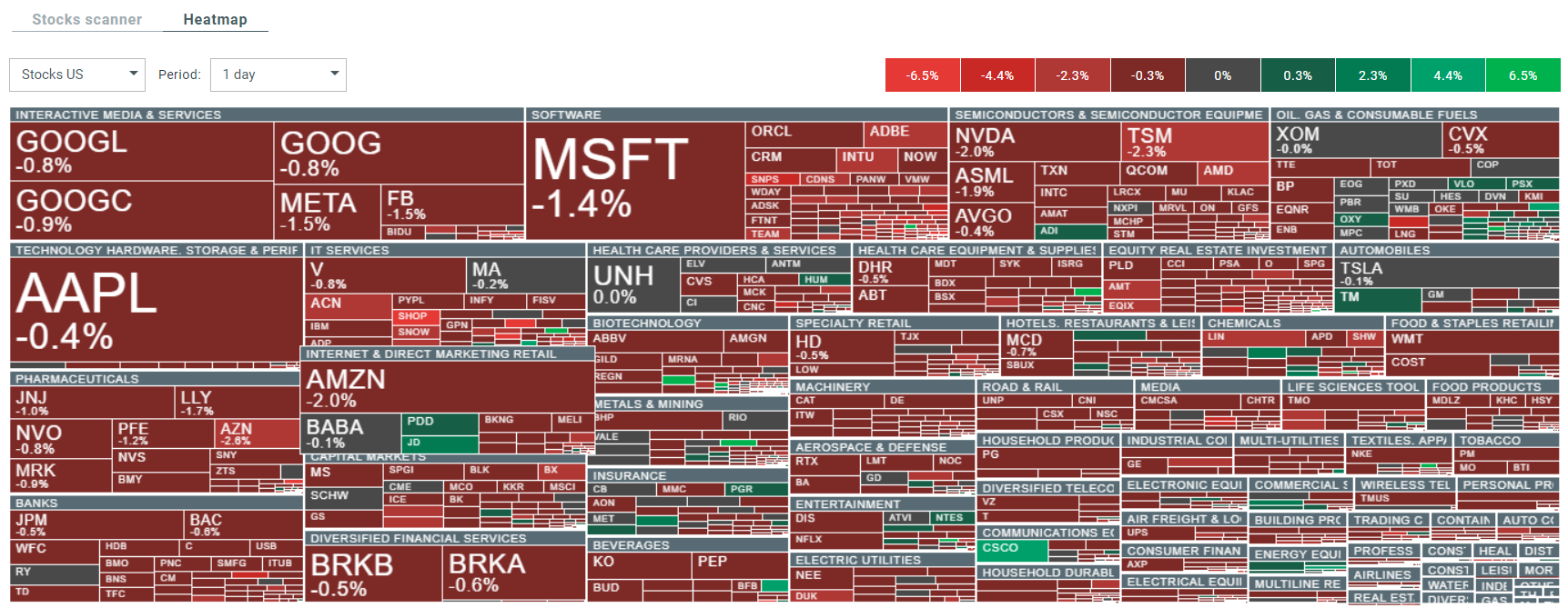 Os stocks do índice S&P 500 categorizados por sectores e indústrias. O tamanho representa o a capitalização bolsita. Fonte: xStation5
