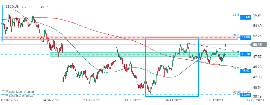 As ações da Cisco Systems (CSCO.US) arrancaram a sessão de hoje mais altas e estão a negociar acima do limite superior do canal descendente. Se o sentimento actual prevalecer, um movimento ascendente pode acelerar no sentido da resistência a $52,00, que é marcado com o limite superior da estrutura 1:1, reações anteriores ao preço e 38,2% de retração Fibonacci da onda ascendente começada em Março de 2020. Fonte: xStation5