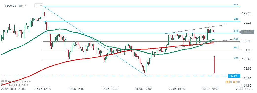 As ações da Tractor Supply (TSCO.US) começaram a sessão de hoje com uma diferença de preço de 7% em baixa e quebraram abaixo dos 23,6 retração de Fibonacci da última onda de queda. Atualmente as ações estão a aproximar-se do suporte dos $169,80. Caso ocorra uma quebra em baixa, o movimento para baixo pode acelerar. Fonte: xStation5