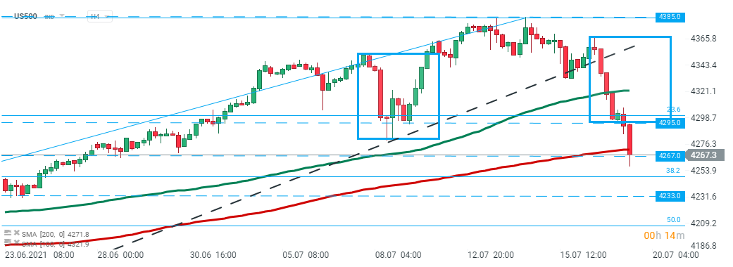 O US500 está a negociar hoje sob forte pressão de venda. O índice quebrou abaixo do suporte principal dos 4295 pontos, que é marcado com o limite inferior da estrutura de 1:1 e retração de Fibonacci de 23,6 da última onda ascendente que começou em meados de maio. Atualmente, o índice está a testar o suporte dos 4267 pontos, que é reforçado pela SMA de 200 (linha vermelha). Por outro lado, se os compradores conseguirem interromper as quedas, outro movimento ascendente em direção ao nível dos 4295 pontos mencionado acima pode começar. Fonte: xStation5
