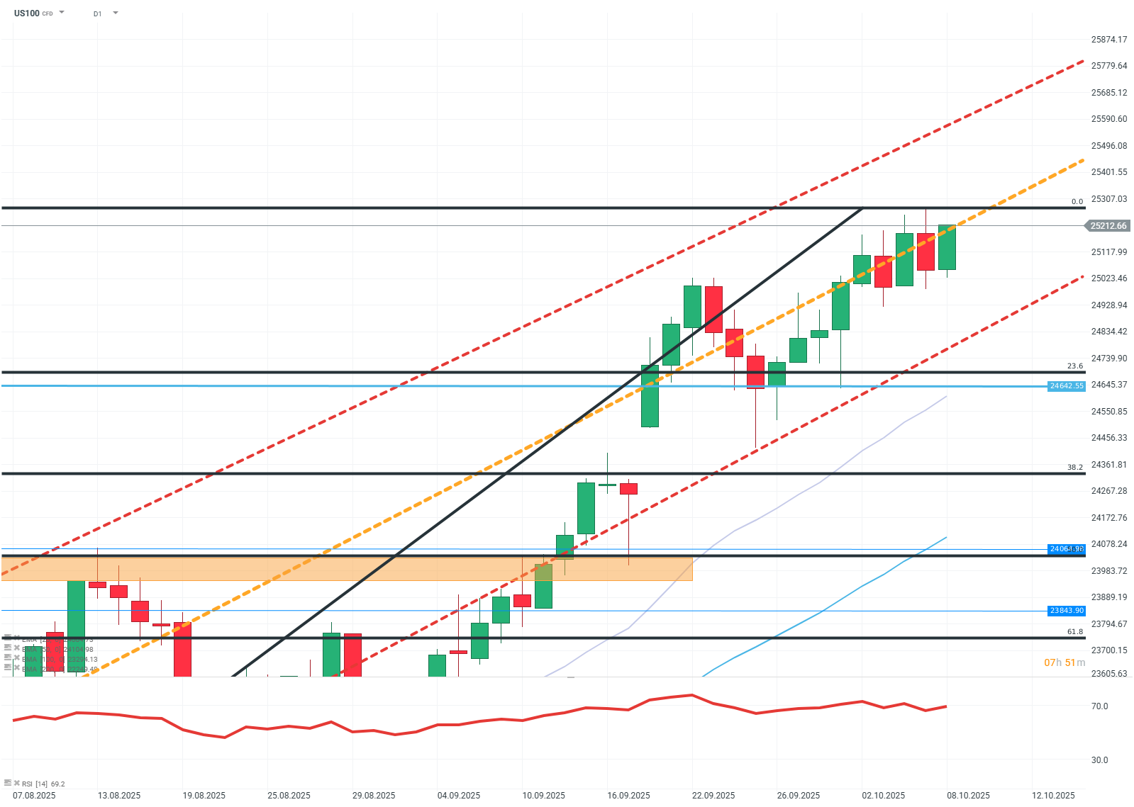 Do ponto de vista técnico, o preço está solidamente dentro de um canal ascendente de longo prazo, cujo limite inferior tem servido efetivamente como suporte por muitos meses. A estrutura da tendência permanece intacta, e a dinâmica do movimento sugere que os compradores ainda controlam o mercado. A única resistência significativa no momento continua sendo o nível do último ATH. No entanto, se ocorrer uma correção descendente, o primeiro suporte significativo será a área de US$ 24.640. Esta é uma zona onde convergem os mínimos locais, a média móvel EMA25 e o nível de retração de Fibonacci de 23,6%. Manter esta zona deve ser crucial para preservar o atual impulso ascendente.