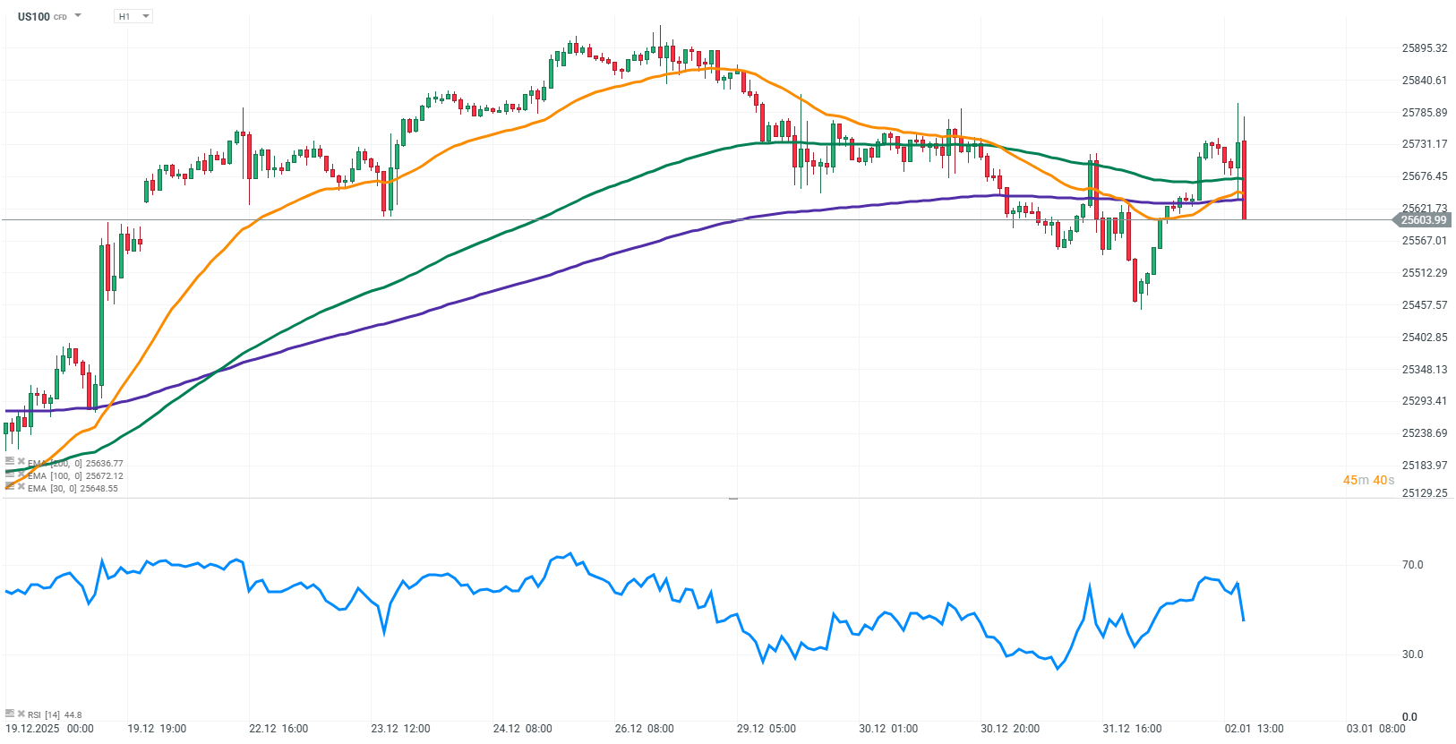 Hoje, os futuros do US100 (Nasdaq 100) estão a recuperar, alimentados pelo crescente interesse no sector da inteligência artificial e pelo otimismo impulsionado pela tecnologia no início de 2026. A elevada procura de empresas relacionadas com a IA está a traduzir-se em ganhos claros para o índice. O gráfico mostra que o preço ultrapassou as médias móveis de curto e médio prazo (EMA 30 e EMA 100), indicando uma potencial dinâmica e força no movimento ascendente. O RSI está a pairar em torno de 55, sinalizando um nível neutro e sugerindo que ganhos adicionais ainda podem ser possíveis sem que o mercado esteja sobrecomprado.