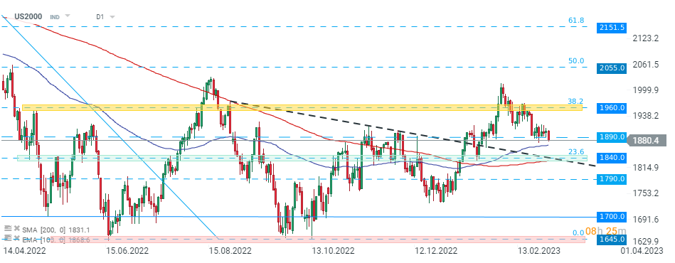 US2000 voltou a recuar, depois dos compradores não terem conseguido ultrapassar acima da marca dos 1960 pts, que coincide com os níveis de Fibonacci nos 38.2%. Durante esta sessão, o índice voltou a estar sob pressão e se a força vendedora prevalecer, o movimento de baixa poderá prolongar-se em direção à zona dos 1840 pts. Fonte: xStation5