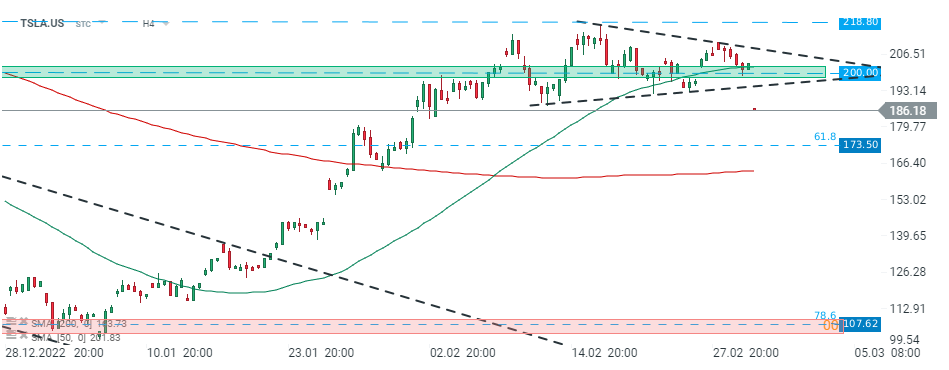 Tesla (TSLA.US) começaram as negociações de hoje com um gap de baixa e o preço aproximou-se novamente da marca dos $173.50, onde coincide os níveis de Fibonacci nos 61.8%. Fonte: xStation5