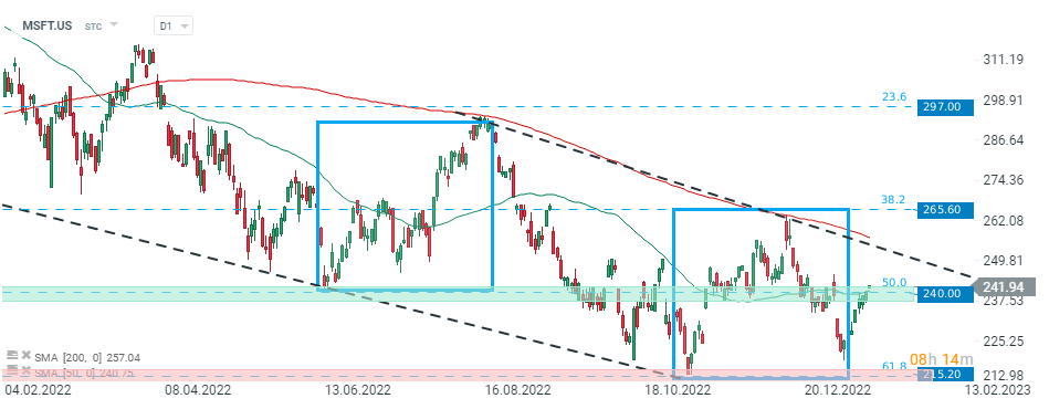 Microsoft (MSFT.US) está a testar a zona de resistência marcada pelos $240.00 que coincide com os níveis de Fibonacci nos 50.0%. Fonte: xStation5
