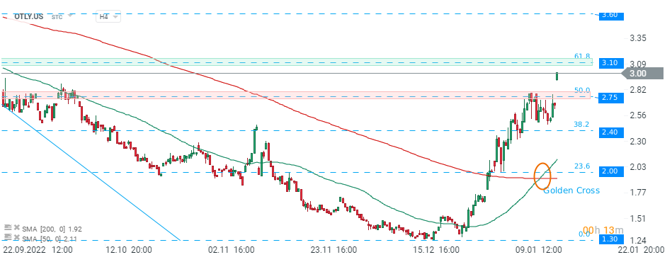 As ações da Oatly (OTLY.US) começaram as negociações de hoje com um enorme gap de alta acima da resistência marcada pelos $2,75 que coincide com os níveis de Fibonacci nos 50,0%. A resistência mais próxima deverá ser marcada pelos $3,10 que coincide com os níveis de Fibonacci nos 61,8%. Fonte: xStation5
