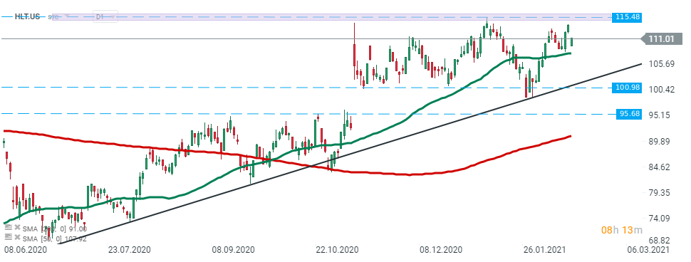 As ações da Hilton Worldwide (HLT.US) têm estado a ser negociadas de forma lateralizada. os compradores não conseguiram quebrar acima dos máximos de todos os tempos nos $ 115,48 durante a sessão de ontem e começaram a sessão de hoje em baixa.O suporte mais próximo a acompanhar está localizado nos $ 100,98. Fonte: xStation5