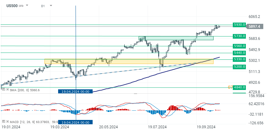 O índice ainda está a consolidar-se em torno do nível dos 5900 pontos, aguardando o próximo catalisador forte para subir ou descer. Esta semana foi impulsionada por um fortalecimento do dólar devido a dados macroeconómicos sólidos. No entanto, um dólar forte pode gradualmente enfraquecer a dinâmica ascendente do índice. Neste contexto, muito dependerá dos resultados trimestrais da próxima semana. Do ponto de vista da análise técnica, o suporte chave é de cerca de 5730 pontos, com resistência acima de 5900 pontos.