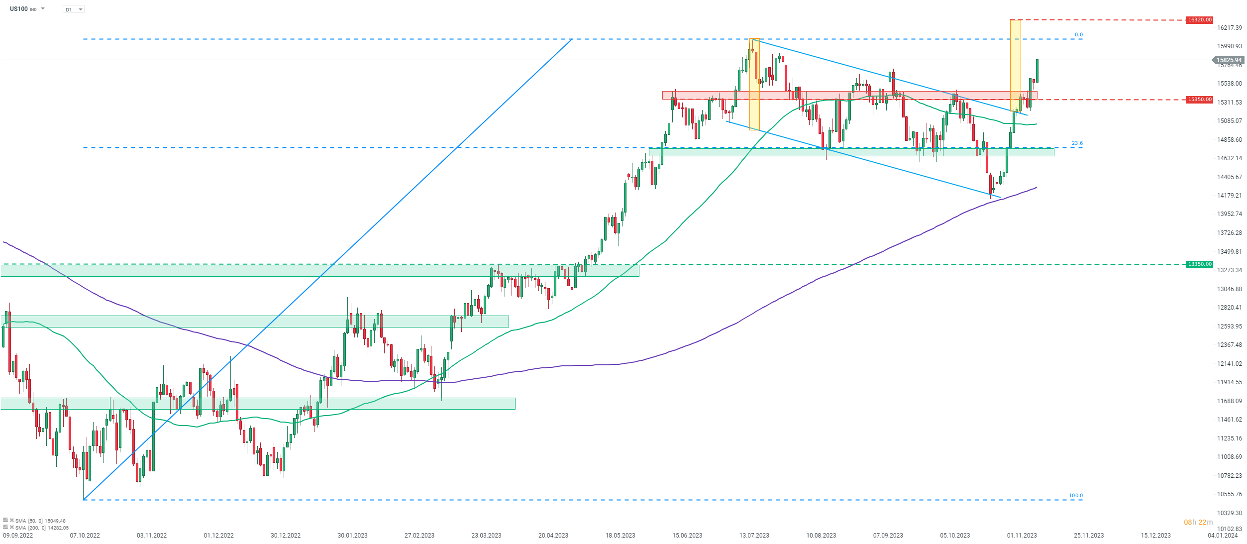 Os futuros do Nasdaq-100 (US100) estendem o movimento ascendente em curso, com o IPC a fornecer mais combustível e motivos para subir. Dando uma olhada no gráfico D1, podemos ver que os ganhos aceleraram após uma quebra acima do limite superior de um canal de baixa, bem como a zona de resistência de 15.350 pts. Um intervalo de quebra do canal sugere uma possibilidade de um movimento tão alto quanto 16.320 pts. O US100 está a ser negociado cerca de 12% acima do mínimo local de 26 de outubro de 2023.