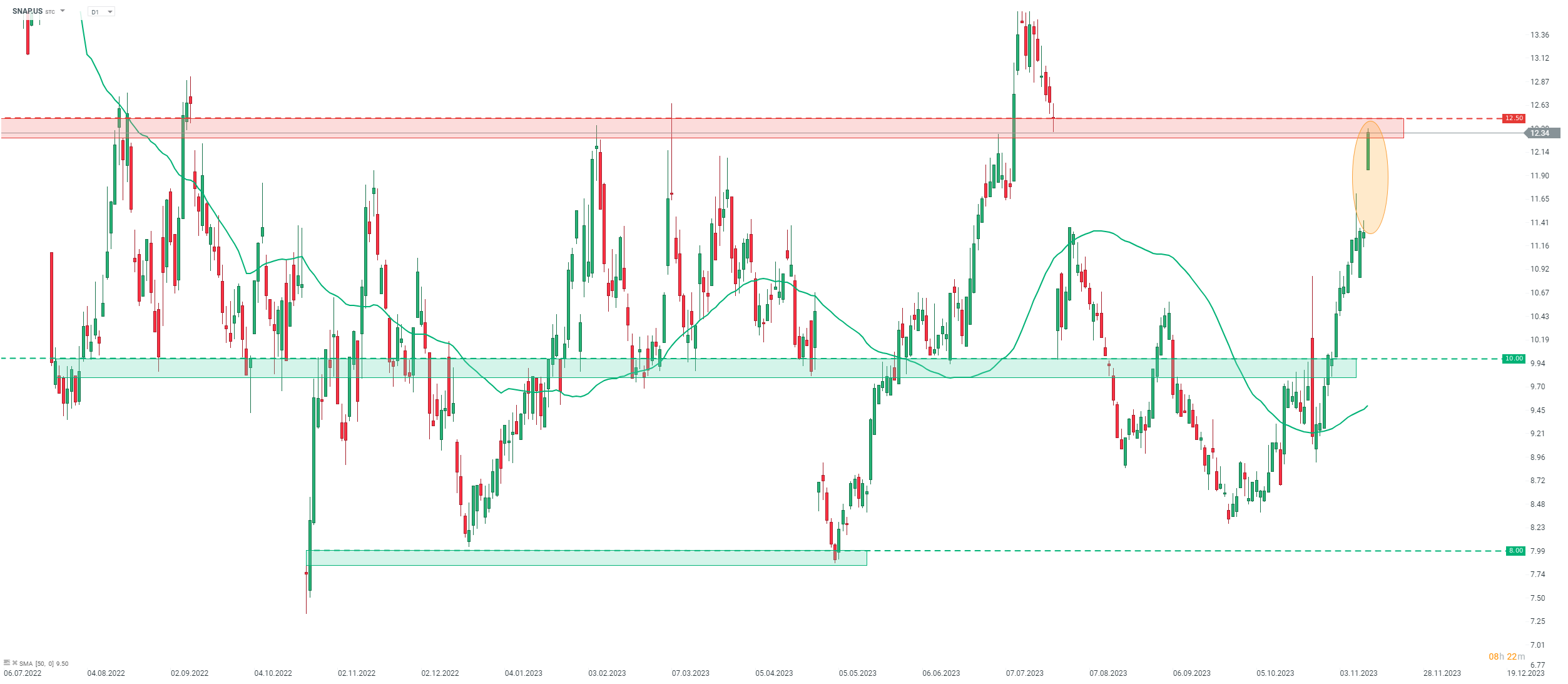 O Snap (SNAP.US) iniciou as negociações de hoje com um gap de alta de preços, após o relatório de informações sobre um acordo com a Amazon. As ações estão a testar a zona de resistência de US $ 12,50, que atua como o limite superior da faixa de negociação em curso. Fonte: xStation5