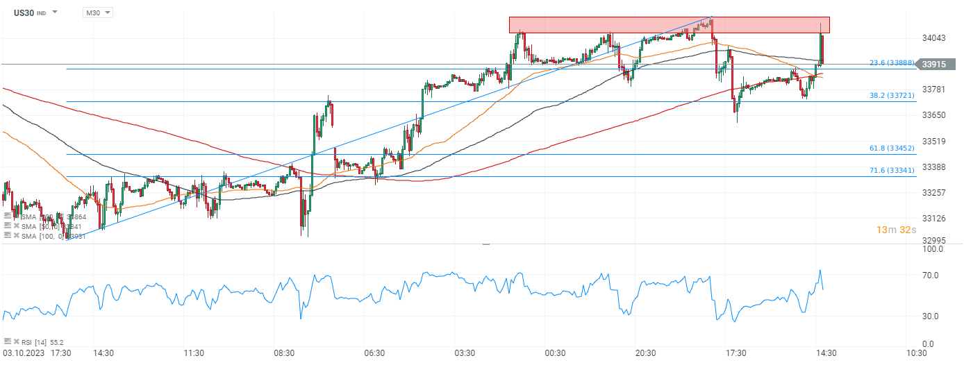 - US30 0,4% vs. perto de 0,9% após a abertura da sessão e cai novamente abaixo dos 34.000 pontos.