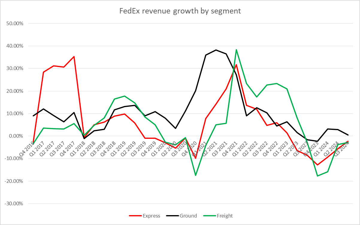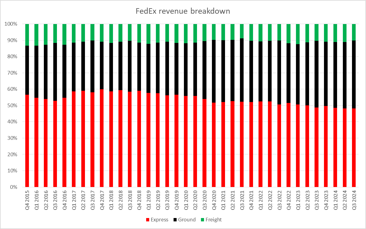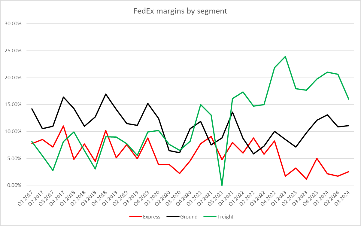 O que parece ser o destaque do lançamento são os dados de margem. Embora a empresa tenha registado margens operacionais ajustadas mais fracas do que o previsto nos segmentos de transporte terrestre e de mercadorias, a margem no seu principal segmento expresso melhorou consideravelmente, superando as expectativas e quase duplicando em relação ao trimestre do ano anterior. Foi registada uma queda bastante considerável na rentabilidade do segmento de carga, com a margem operacional ajustada a cair de 17,7% há um ano para 16,0% atualmente. No trimestre anterior (segundo trimestre fiscal de 2024), a margem neste segmento situou-se em 20,6%. No entanto, embora o segmento de transporte de mercadorias seja o segmento da FedEx com a margem mais elevada, é também o segmento mais pequeno, representando cerca de 10% das receitas da empresa no período mais recente.