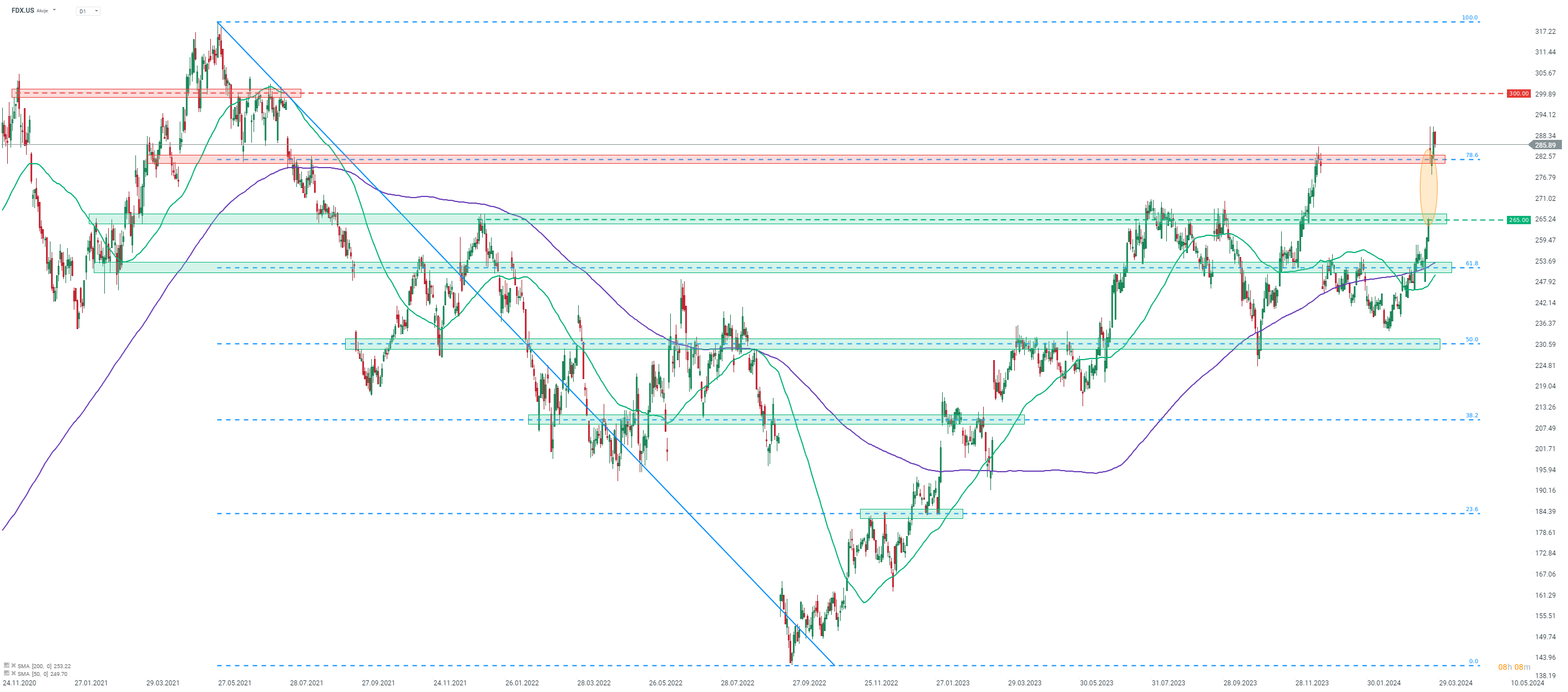 A FedEx (FDX.US) subiu mais de 7% na sexta-feira, em resposta à divulgação dos resultados do terceiro trimestre fiscal de 2024 após o fecho do mercado na quinta-feira. Este foi o maior salto em um único dia para as ações no ano! Dando uma olhada no gráfico no intervalo D1, podemos ver que a ação iniciou as negociações de sexta-feira com um grande gap de preços de alta (círculo laranja). Isso empurrou o preço acima da zona de resistência de $ 282, marcada com reações de preços anteriores e retração de 78,6% do movimento descendente lançado no final de maio de 2021, e para os níveis não vistos desde o final de julho de 2021. Se o sentimento otimista em relação às ações prevalecer, a próxima zona de resistência a ser observada pode ser encontrada na área de $ 300.