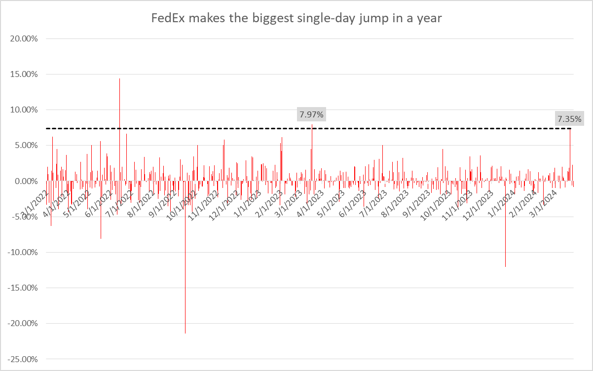 As ações da FedEx deram o maior salto em um único dia em um ano depois que a empresa anunciou um novo programa de recompra. Fonte: Bloomberg Finance LP, XTB