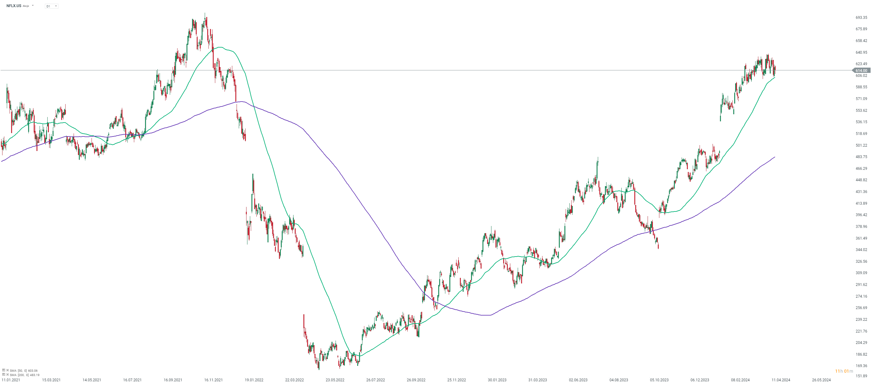 Por último, mas não menos importante, vamos dar uma olhadela ao gráfico da Netflix no intervalo D1. Olhando para o gráfico, podemos ver que tem estado a negociar num forte movimento ascendente há quase 2 anos. A ação disparou quase 300% desde os mínimos de maio de 2022. No entanto, o avanço foi interrompido na área de oscilação de $ 640, marcada com altos e baixos locais do final de 2021. As ações têm estado a ser transaccionadas, na sua maioria, lateralmente no intervalo de 605-635 dólares ao longo do último mês, e parece que os analistas estão à espera do catalisador para o próximo grande movimento. A divulgação dos resultados do primeiro trimestre poderá ser esse catalisador. Se o relatório surpreender pela positiva, com mais um trimestre de forte crescimento do número de subscritores, poderá seguir-se outro pico no preço das ações. Nesse cenário, os máximos de todos os tempos na área de US $ 700 que foram alcançados no final de 2021 se tornarão o foco dos touros.