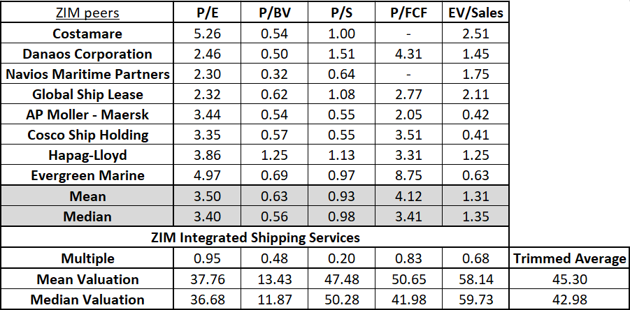 Os múltiplos da ZIM e dos seus concorrentes são apresentados no quadro seguinte. Como se pode ver, a companhia de navegação israelita negoceia a múltiplos muito mais baixos do que os seus pares. O rácio preço/valor contabilístico da ZIM é ligeiramente inferior à média ou à média dos seus pares, mas os outros múltiplos são significativamente inferiores às médias. A avaliação das acções da ZIM utilizando os múltiplos médios e medianos resulta numa avaliação acima do mercado para cada um dos múltiplos utilizados. As avaliações médias aparadas, excluindo as mais elevadas e as mais baixas, sugerem uma subida de cerca de 400% em relação aos preços de mercado actuais.