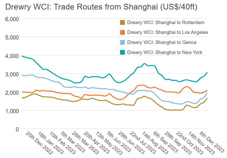 Os custos mais elevados, bem como a deterioração geral da situação de segurança no Mar Vermelho, estão a fazer subir os custos do frete. O Drewry World Container Index subiu de cerca de 1.382 dólares por contentor de 40 pés no final de novembro para mais de 1.660 dólares atualmente. O índice para a rota comercial Xangai-Roterdão subiu de $1.171 por contentor de 40 pés no final de novembro para $1.667 agora, um aumento de mais de 40% em três semanas.
