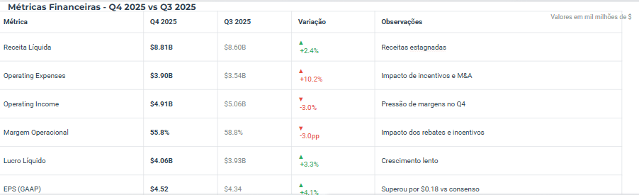 Em termos gerais, a empresa registou um crescimento de dois dígitos nas principais métricas financeiras, com destaque para a receita total de $32,8 mil milhões (+16% YoY) e um lucro líquido de $15 mil milhões (+16%). Paralelamente, o lucro operacional cresceu 21%, atingindo $18,9 mil milhões, refletindo a forte alavancagem operacional do negócio.