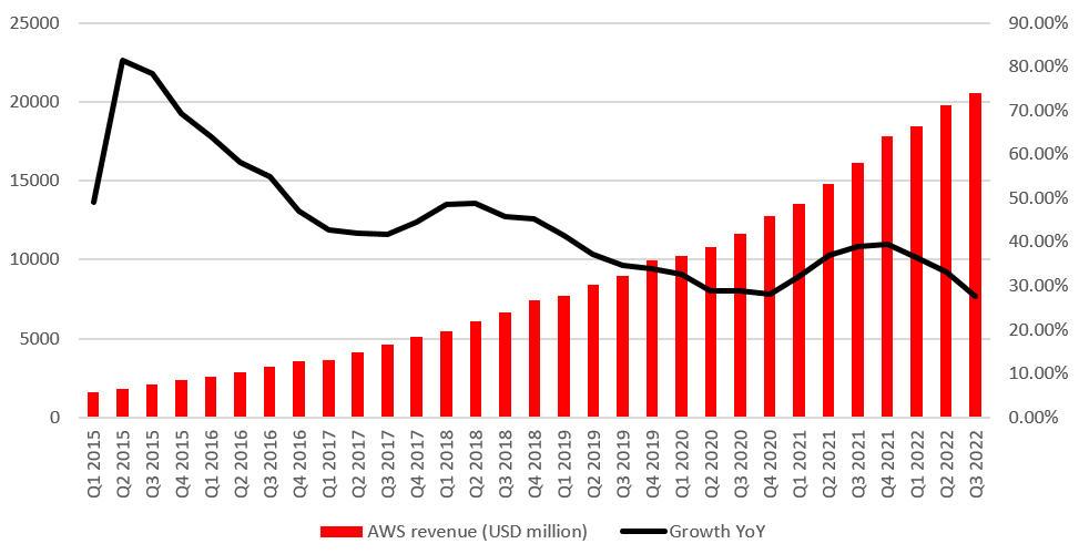 A Amazon registou a taxa de crescimento mais baixa do seu segmento das clouds no seu registo. Fonte: Amazon, XTB