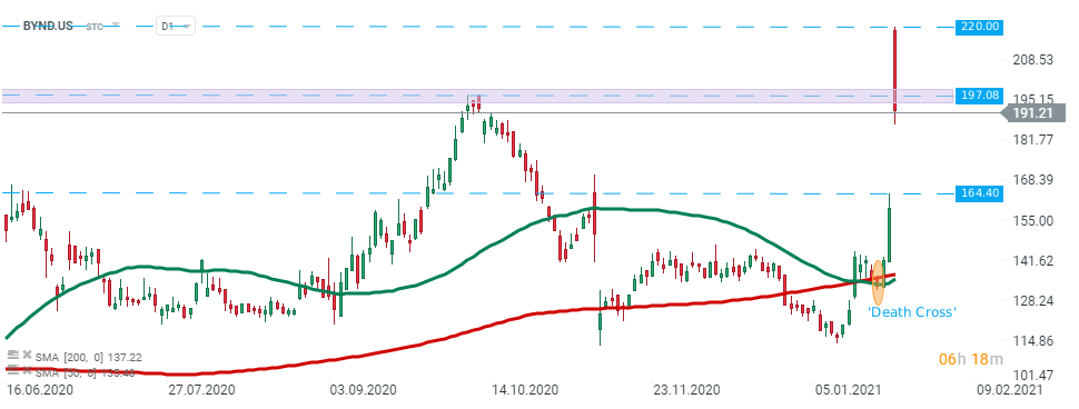 As ações Beyond Meat (BYND.US) começaram a sessão de hoje com um gap de alta, no entanto, os compradores não conseguiram quebrar a resistência localizada nos $ 220,00 e o preço acabou por recuperar. As ações quebraram abaixo do suporte localizado nos $ 197,08 e se o sentimento atual prevalecer, o movimento de queda poderá ser estendido para a zona dos $ 164,40. Enquanto isso, a SMA 50 (linha verde) quebrou abaixo da SMA 200 (linha vermelha) acabando por fazer com que ambas as EMA se cruzassem. Embora este seja um padrão que poderá apresentar o retomar da força compradora, deve-se notar que muitas vezes é um padrão apresenta "delays" na reação do preço, portanto, os investidores devem ser cautelosos ao tentar negociar baseado nesse sinal do mercado. Por outro lado, se os compradores conseguirem retomar a tendência de alta no preço acima dos $ 197,08, o movimento em direção aos máximos relativos recentes pode ser algo a considerar. Fonte: xStation5