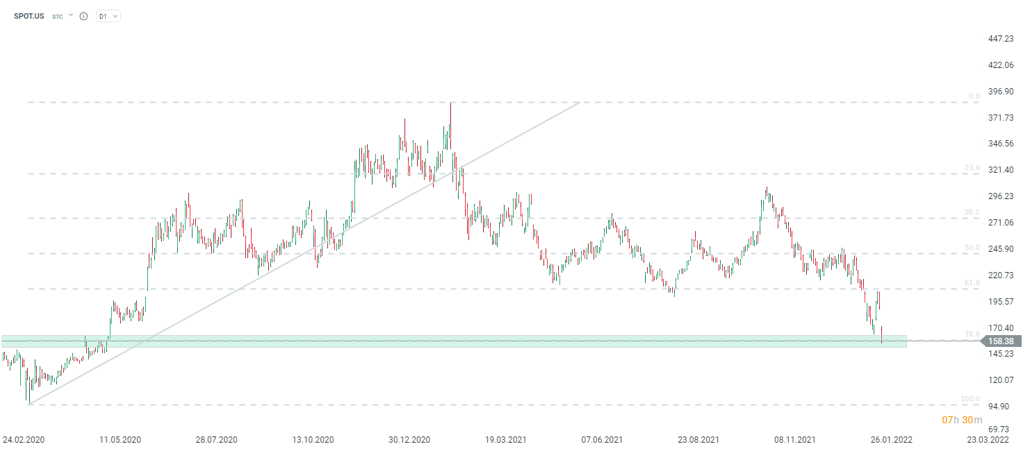 As ações da Spotify (SPOT.US) começaram a sessão de hoje com um enorme gap de baixa. Fonte: xStation 5
