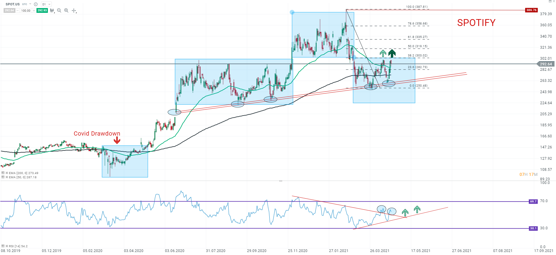 Mesmo que as ações tenham vindo a valorizar mais de 295%, desde os mínimos atingidos em março de 2020, o preço da Spotify durante o segundo semestre do ano passado tem vindo a ser muito lateralizado e desde que as açõres atingiram máximos que os vendedores conseguiram assumir o controlo do preço e provocaram um movimento de baixa em direção à EMA de 20.