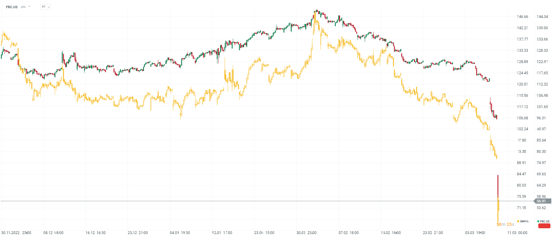Ações do First Republic and Signature Bank (SBNY.US,gráfico amarelo). Fonte: xStation5