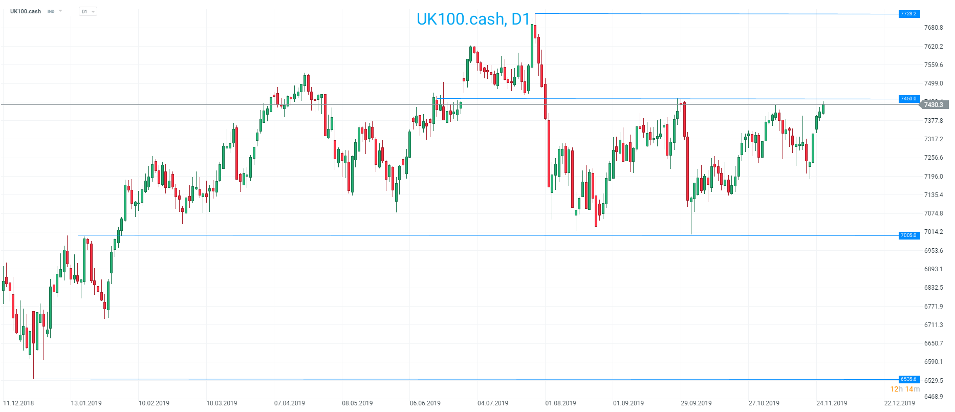 O FTSE 100 está à procura do quarto dia de ganhos, atingindo o nível mais alto desde setembro e à procura de um ponto de entrada para quebrar decisivamente acima da resistência anterior nas proximidades de 7450. As ações na Europa estão no verde e os futuros Norte Americanos a apontar para novos máximos de todos os tempos para os principais índices de referência, antes da pausa para o feriado de Ação de Graças. As ações dos retalhistas estarão em foco nos próximos dias, antes da Black Friday, entre alas algumas são blue chips do Reino Unido, que têm tido um desempenho fraco, como a JD sports, a Tesco e Ocado.