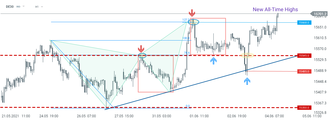O DE30 continua em alta, os principais benchmarks de ações do Velho Continente estão a fechar a semana no verde. O índice alemão quebrou acima de 15.668 pts, o que coincide com o retrocesso de Fibonacci de 127,2% do movimento descendente do final de maio. Além disso, o índice ultrapassou o limite superior da estrutura Overbalance, onde os máximos históricos anteriores de 1º de junho podem ser encontrados.