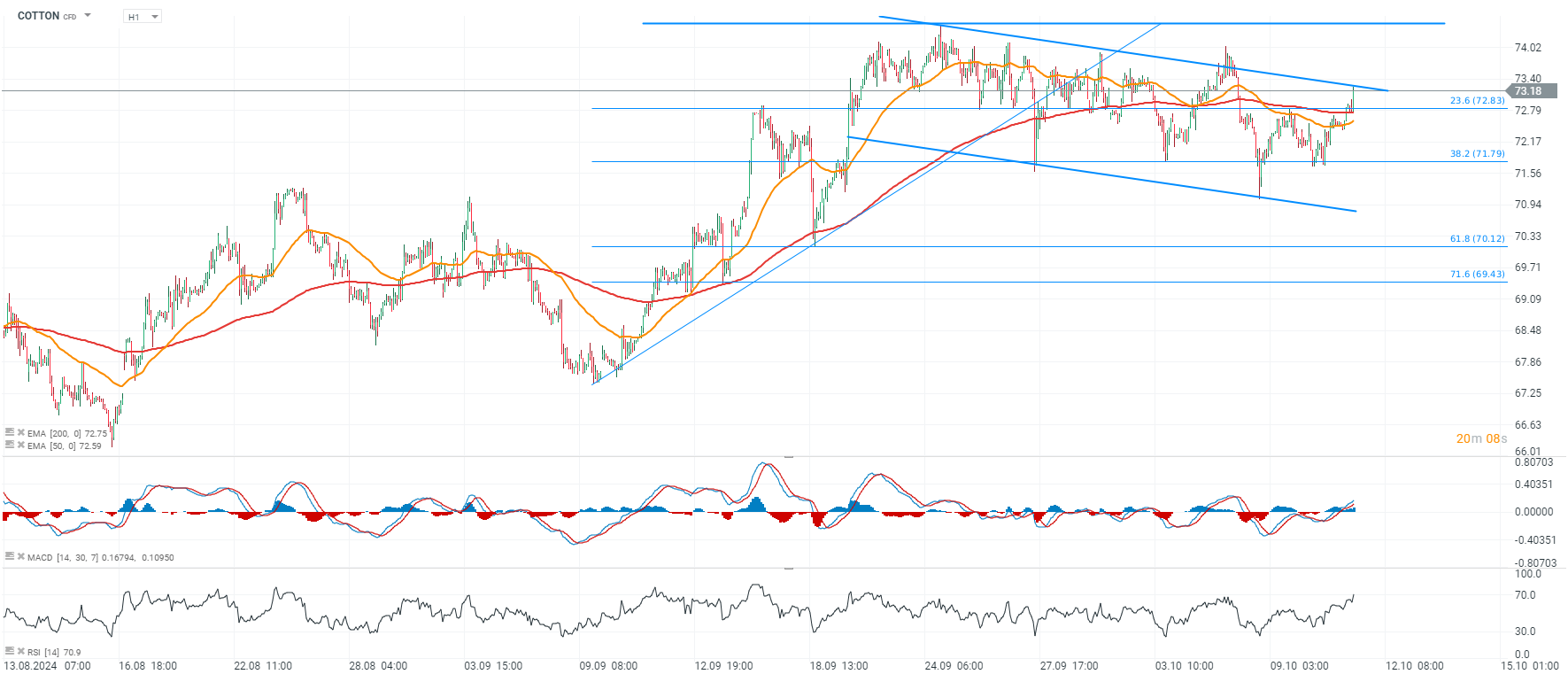 - Por enquanto, o progresso das colheitas nos EUA a partir de 6 de outubro foi de 26%, e agora podemos especular que é de cerca de 30%. Se o USDA WASDE de hoje mostrar muito mais do que os cortes de produção esperados (especialmente nos EUA), podemos esperar que o algodão teste a resistência perto de $74-$75 com potencial quebra acima desses níveis.