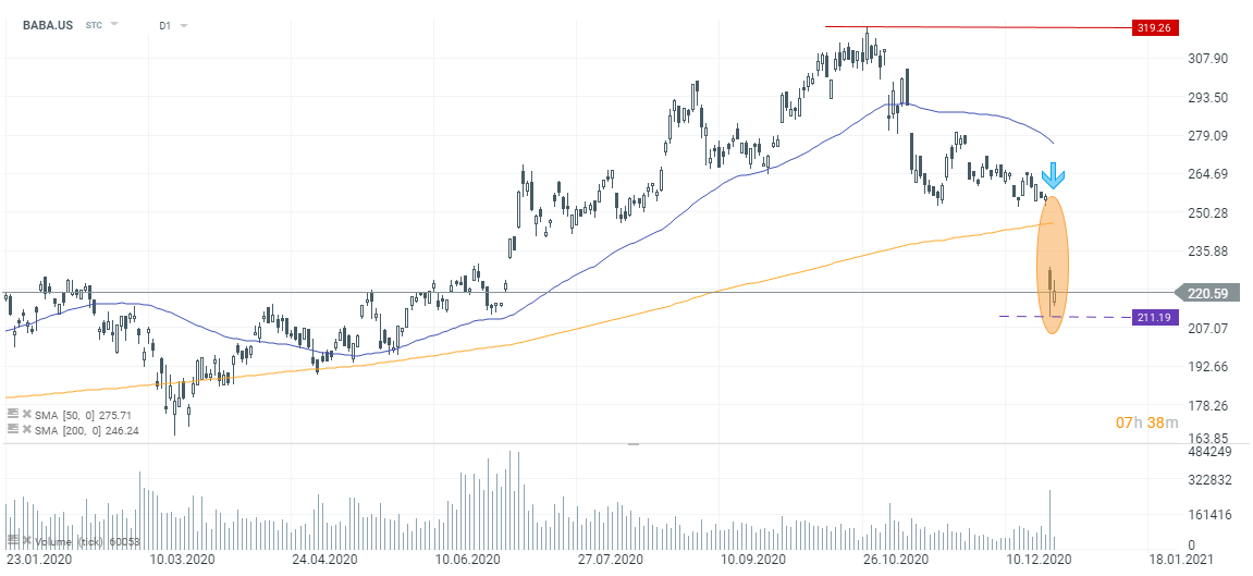 As ações da Alibaba (BABA.US) voltam a estar em destaque pela segunda sessão consecutiva, pois a empresa ainda está sob enorme pressão dos regulados. No sábado, o Banco Popular da China ordenou que o Ant Group reformulasse as suas atividades e cumprisse os requisitos regulamentares. A mudança ocorre devido a um maior escrutínio das práticas antimonopólio na China. É mais um sucesso para o Alibaba, uma vez que possui uma participação de 33% no Ant Group - a maior empresa de tecnologia financeira do mundo. Anteriormente, o regulador de mercado da China lançou uma investigação antitruste no Alibaba Group. Em resposta, a empresa anunciou que aumentaria seu programa de recompra de ações de US $ 6 bilhões para US $ 10 bilhões. No entanto, a decisão não diminuiu as preocupações sobre o futuro da empresa - alguma leve pressão de venda ainda existe. As ações caíram mais de 30% desde 27 de outubro.