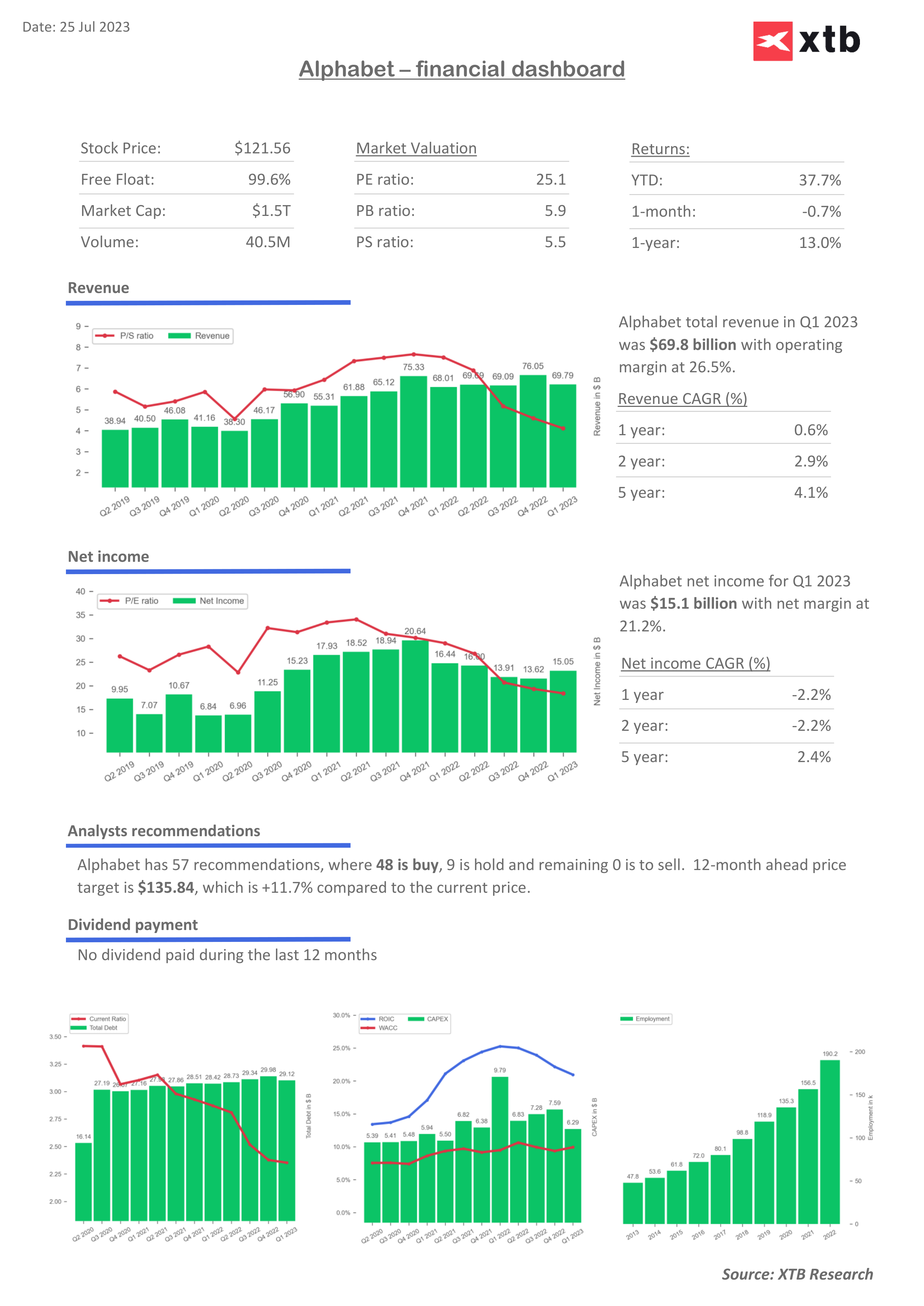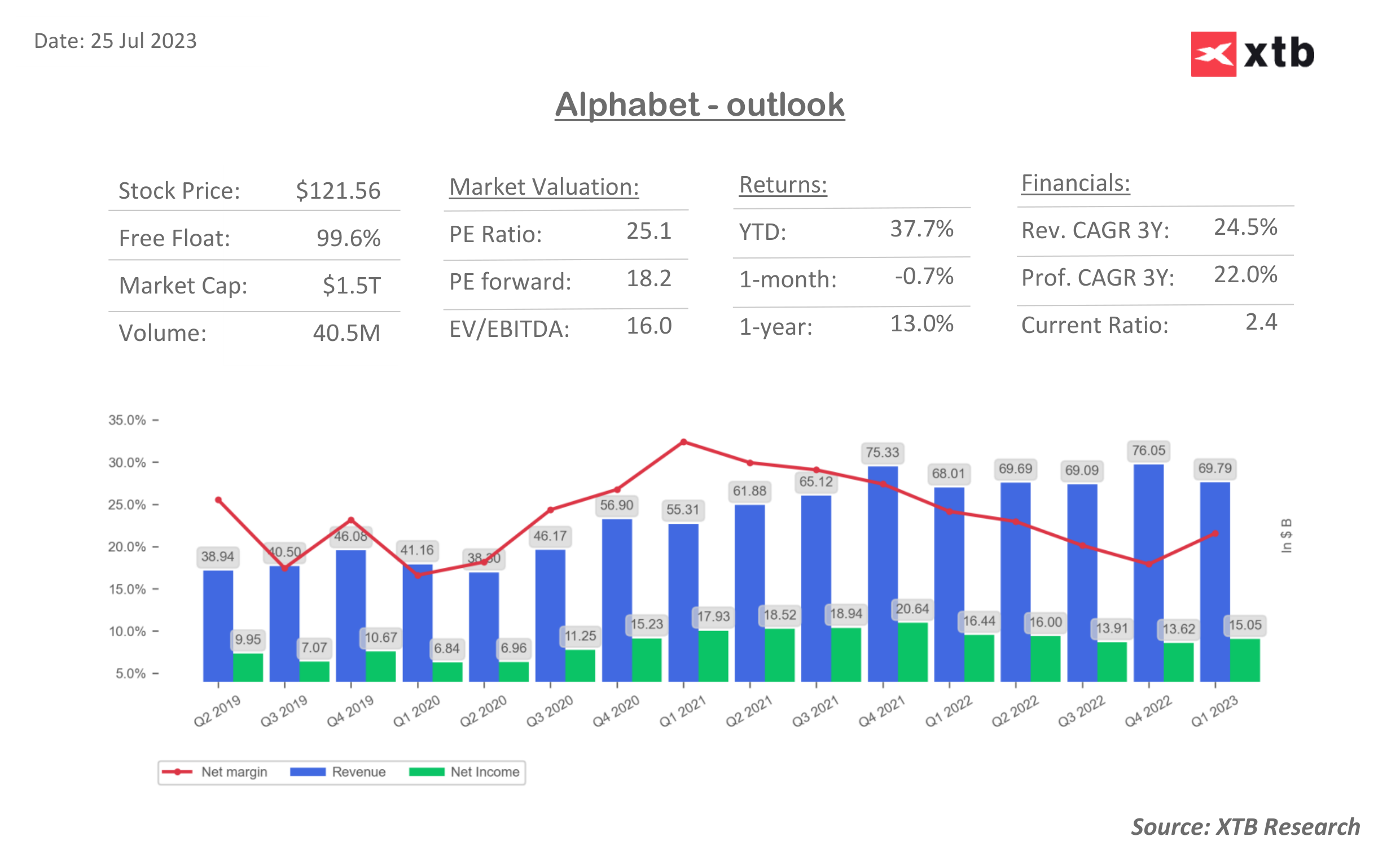 Os resultados mostraram que a empresa mantém a sua posição líder nos mercados de pesquisa e publicidade. Uma recuperação no sector da publicidade poderá ajudar a empresa a aumentar os gastos em modelos de IA generativa e a melhorar ainda mais as capacidades de pesquisa da Google. A maior componente dos investimentos da Alphabet no segundo trimestre foram os servidores e os modelos de IA. A empresa está a testar como e onde colocar anúncios de pesquisa num motor de busca cada vez mais baseado na inteligência artificial. De acordo com o diretor comercial Schindler, cerca de 80% dos anunciantes utilizam pelo menos um produto de pesquisa com IA. A Google pretende integrar a IA generativa no Gmail e no Android. Os analistas também esperam que o crescimento do negócio de computação em nuvem da Google acelere no final de 2023 (com um mínimo em junho) se a incerteza macroeconómica começar a diminuir, impulsionando as despesas das empresas.