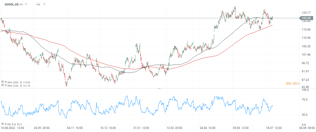 Se as ações da Alphabet (GOOGL.US) abrirem com uma diferença de 7%, isso apontaria para US $ 130 - um nível visto pela última vez em abril de 2022. A média SMA100 provou ser um nível de suporte significativo. Fonte: xStation5