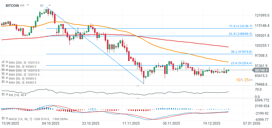 De uma perspetiva de retração de Fibonacci (por exemplo, o nível de 23,6%), a área de $91.500 destaca-se como uma zona de resistência particularmente importante, reforçada por reações anteriores dos preços. A EMA50 e a EMA200 situam-se atualmente em torno de $93.500 (perto das máximas locais recentes) e $103.000, respetivamente. A faixa de $91.500 a $93.500 pode, portanto, tornar-se um importante teste de resistência para os otimistas. É importante ressaltar que o canal descendente que guiou o Bitcoin para baixo até o início de dezembro foi quebrado, com o preço agora entrando em uma zona de consolidação marcada por uma volatilidade muito baixa.
