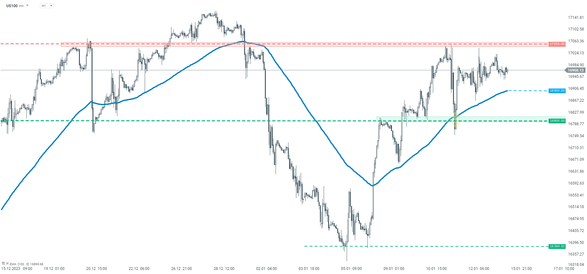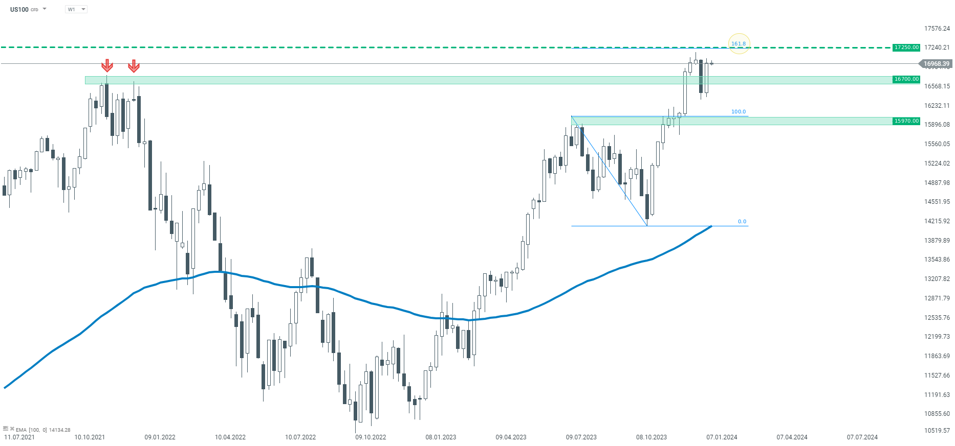 O US100 tem estado numa trajetória ascendente desde o início de 2023, atingindo novos máximos de sempre em dezembro, antes de um recuo temporário no início de janeiro de 2024. No entanto, como evidenciado pelo gráfico semanal, a atual tendência ascendente parece permanecer intacta. A zona de 16700 pontos deve ser vista como um nível de suporte temporário. De acordo com a análise técnica, enquanto os preços se mantiverem acima deste nível, espera-se um crescimento contínuo.