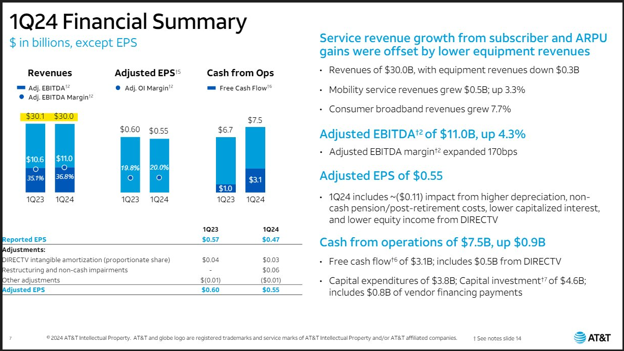 - Os ganhos por ação foram inferiores em $0,11 devido a factores pontuais, entre os quais a empresa citou a fraqueza dos serviços da DIRECTV, custos de indemnização relacionados com pensões e menor capitalização de juros. Ao mesmo tempo, o fluxo de caixa livre aumentou significativamente para US$ 3,1 mil milhões, em comparação com US$ 1 mil milhões no primeiro trimestre de 2023.