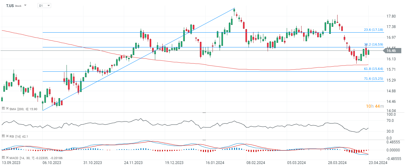 Os lucros de uma das maiores empresas de telecomunicações dos Estados Unidos, a AT&T (T.US) , superaram as expectativas, embora as vendas tenham sido inferiores às previsões, num ambiente altamente competitivo. Como resultado, as acções da empresa estão a ser negociadas hoje em alta de 3,5% antes da abertura. A AT&T registou 30 mil milhões de dólares em receitas (menos cerca de 100 milhões de dólares em relação ao ano anterior), abaixo das previsões de 30,53 mil milhões de dólares. No entanto, o lucro por ação de US $ 0,55 (queda de 12% em relação ao ano anterior, de US $ 0,6 no primeiro trimestre de 2023) para o primeiro trimestre de 2024 ficou acima da previsão. O mercado esperava US $ 0,53.