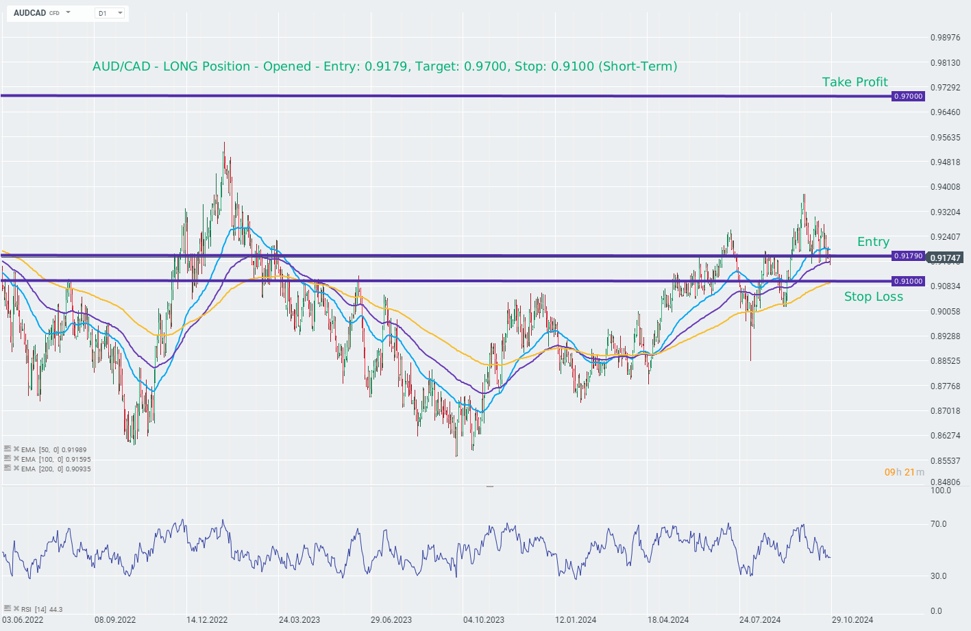 Morgan Stanley recomenda tomar uma posição longa em AUDCAD ao preço de mercado com um objetivo de 0.9700 e uma ordem de stop loss em 0.9100. Fonte: xStation5